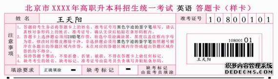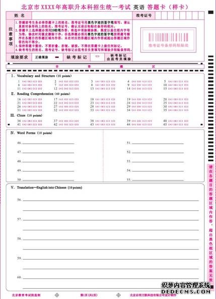 2014年北京市高职升本科公共课考试英语科目采用网上评卷方式。考生在进行英语科目考试作答时,务必将全部答案填涂(或填写)在指定答题卡上,不得在试卷和草稿纸上作答。选择题的答案用2B铅笔将答题卡上对应题目的答案选项涂满涂黑,黑度以盖住框内字母为准;非选择题答案用黑色字迹的签字笔(建议用0.5mm黑色字迹的签字笔书写)按题号顺序作答在黑色框答题区域相应位置内,未在对应的答题区域作答或者超出答题区域作答的均不得分。